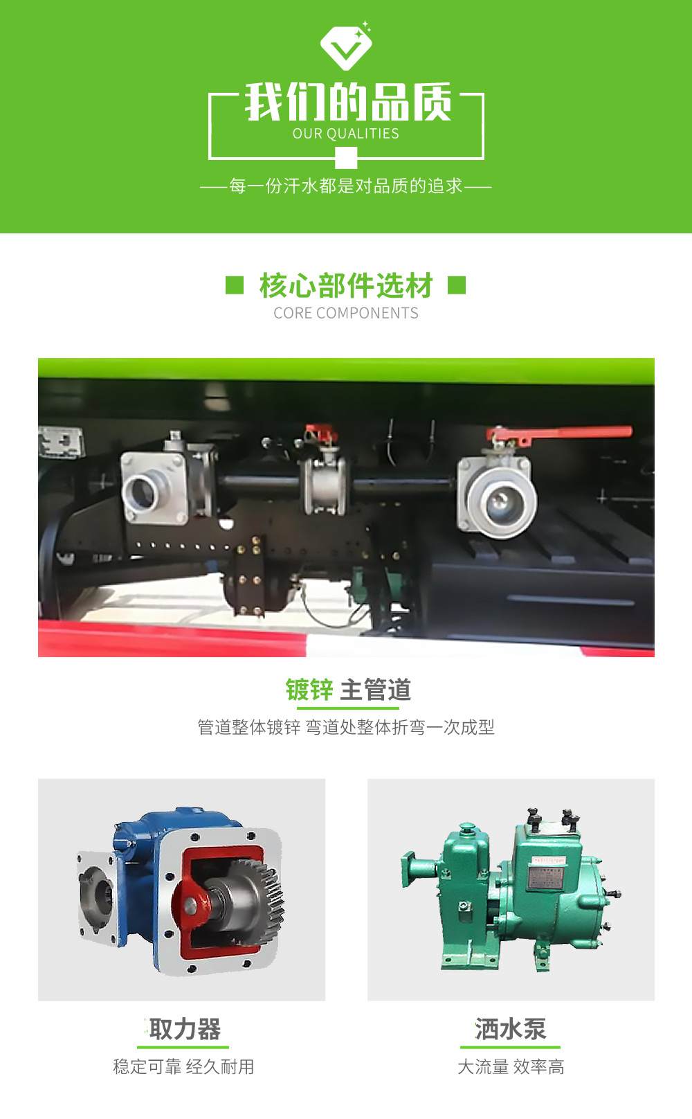 專用功能配置:罐體實際容積約為3立方米(罐體有效參數是2.6立方米),采用武鋼優質碳鋼板卷壓成型。配備專用灑水泵,自吸自排,左右對沖、后灑、側噴、后工作平臺及灑水高壓炮。灑水泵自吸高度為6米左右,整車灑水寬度14米左右,后工作平臺水炮可調成:直沖狀、大雨、中雨、小雨、毛毛雨,有效射程≥28米,整車帶接頭、水位計,自流閥及自吸功能。后平臺主管道有一個一寸的澆花接口,附送2根3米水管,1個爬梯,兩側及后保險杠。
