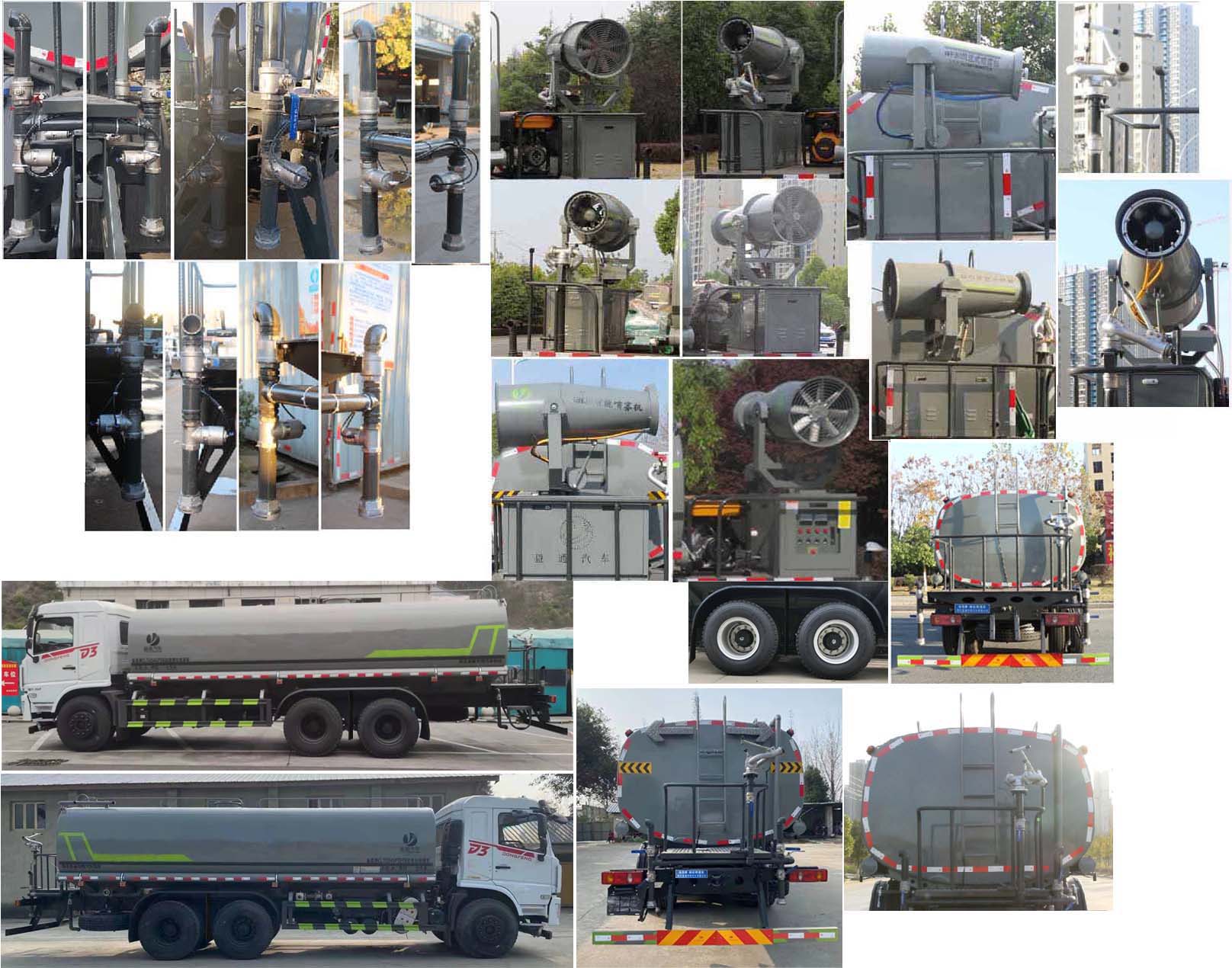 該車主要用于城鄉園林綠化噴灑;主要裝置為罐體及噴灑裝置;隨底盤選裝駕駛室,選裝遮陽板上"東風商用車”字及不帶遮陽板,選裝噴霧裝置樣式,選裝油箱出口位置;罐體總容量:14.81立方米;罐體有效容積:14.11立方米;罐體外形尺寸(長×長軸×短軸)(mm):6800×2390×1620,6800×2400×1450;側、后防護材料均為:Q235,連接方式均為:螺栓連接,后部防護截面尺寸(mm):120×50,后部防護離地高度(mm):460;ABS型號/生產廠家:3631010-C2000/東科克諾爾商用車制動系統(十堰)有限公司.采用4350+1350(mm)軸距.選裝水炮支架安裝位置,選裝高位花灑管道樣式,選裝自動球閥安裝位置。選裝擋泥板樣式,選裝箭頭燈裝置,選裝后部樣式。后部作業燈僅在作業時開啟,車輛行駛過程中不可開啟.