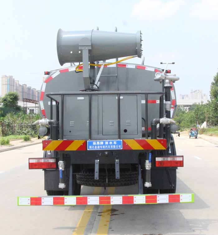東風(fēng)15噸灑水車產(chǎn)品標(biāo)配前噴(鴨嘴)、后沖、后灑、側(cè)噴、后置式工作 平臺(tái),平臺(tái)上配置綠化水炮(可 360°旋轉(zhuǎn),既可以調(diào)成柱狀,也可 以調(diào)成霧狀,更可以調(diào)成直沖狀、大雨、中雨、小雨、毛毛雨),配 備優(yōu)質(zhì)大功率專用灑水泵(可自吸自排,可從河里或池塘抽水到罐體), 取力器,雜物過濾網(wǎng),消防接口,自流球閥系統(tǒng)、取力器、球閥、濾網(wǎng) 均為國(guó)家標(biāo)準(zhǔn)產(chǎn)品