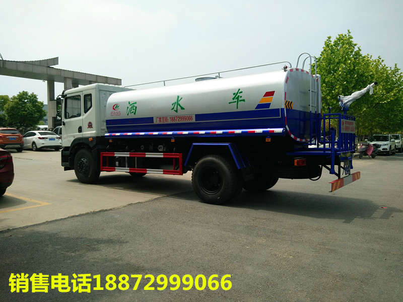 東風15噸灑水車隨底盤選裝駕駛室;品名:;密度:1000千克/立方米;有效容積:11.45立方米;外形尺寸長(mm)/軸距(mm)/后懸(mm)/罐體尺寸(×長軸×短軸)(mm)對應關系灑水車吸程≧7米,灑水寬度≧14-16米,射程25-30米,引水時間<5min,流量60m3/h。前沖()、后灑、帶側噴(花灑)、帶后工作平臺、平臺上安裝綠化灑水高炮(炮噴射形狀可調節:直沖、大雨、中雨、毛毛雨、霧狀、可連續調節,360°旋轉),配消防接口,自流閥,濾網,帶自吸自排功能配備大功率專用灑水泵,泵可自吸自排,安裝過濾網,帶消防接口,可通過消防栓進水,帶自流閥,隨車選裝20米綠化卷盤,可噴灑農藥,罐體金屬漆。罐體有橢圓和方圓罐兩種,可根據用戶的要求定做。