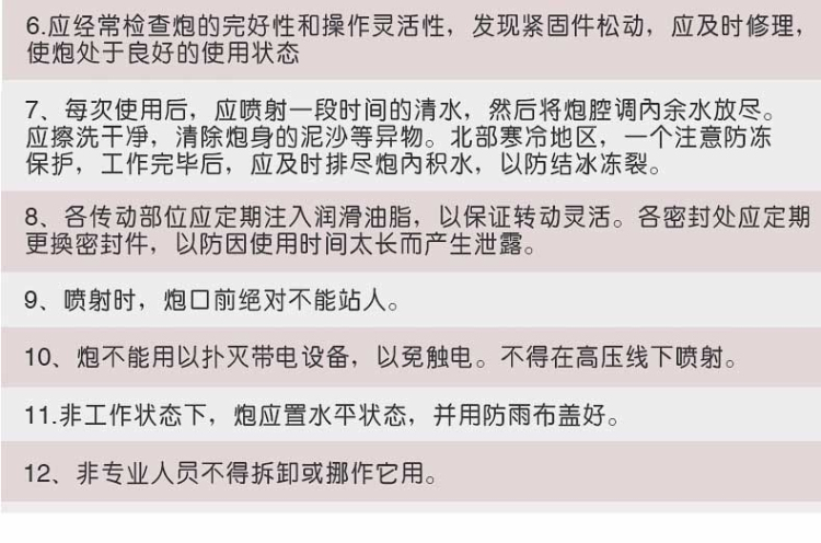 灑水車灑水炮技術(shù)說明 灑水炮是灑水車管路噴水設(shè)備中的最主要部件。灑水車灑水炮材質(zhì):使用專用防腐防銹鋁合金材質(zhì),灑水炮法蘭管道口內(nèi)徑為50/65mm。灑水炮連接方式為法蘭連接,與水炮座相連處稱水炮上法蘭,水炮座為水炮下法蘭。灑水炮由五部分組成:水炮頭、水炮桿,水炮三通和水炮法蘭,手柄。用戶在使用時(shí)只需要打開管路閥門,調(diào)節(jié)水炮到所需要的噴灑狀態(tài),站在灑水車的操作平臺(tái)上握住手柄,就可以輕松便捷的操作了。用途:主要用于園林綠化,礦區(qū)壓塵,公路兩側(cè)澆灌花,灑水車灑水炮可任意旋轉(zhuǎn)方向,可調(diào)節(jié)到任意角度,可根據(jù)用戶需要上下左右自由調(diào)節(jié)。射程可達(dá)20-28m.可調(diào)節(jié)成水柱狀,大雨、中雨、毛毛雨、霧狀。