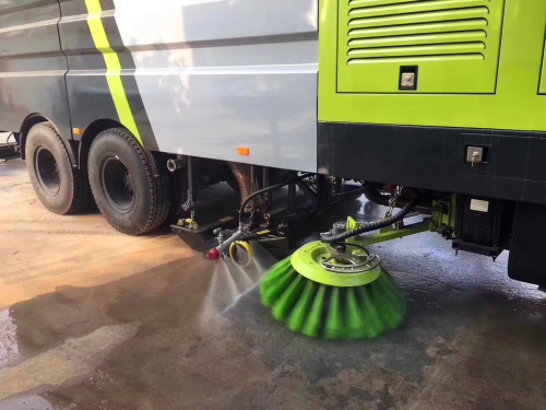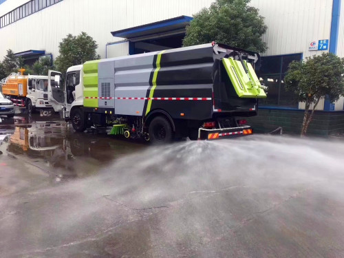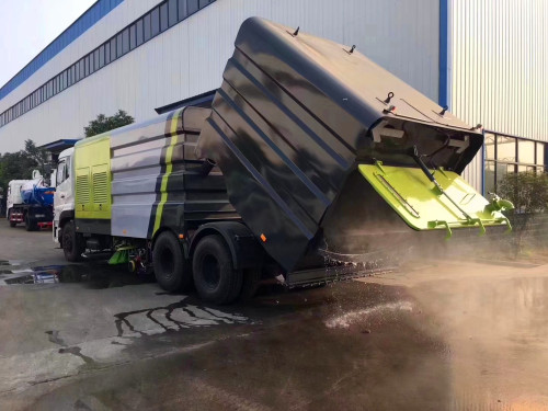 該洗掃車采用東風天龍二類底盤改裝,加裝副發動機、風機、清水箱、垃圾箱、左右立掃、掃盤降塵系統、左右高壓側噴高、吸盤內置高壓主噴桿、氣動系統、液壓系統、專用裝置電控系統和副車架等改裝而成,