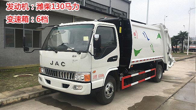 江淮駿鈴壓縮式垃圾車,駿鈴寬體駕駛室,揚州濰柴130馬力發動機,6檔變速箱,7.50R16鋼絲胎,動力轉向,離合助力,斷氣剎,ABS。