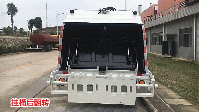 容積7~8立方米,弧形箱體,邊四底四碳鋼材質,采用國內品牌油缸、高密度油管,多路閥和油泵,帶推板、刮板,后反轉樣式選裝,翻轉進料,后部帶鎖緊門。