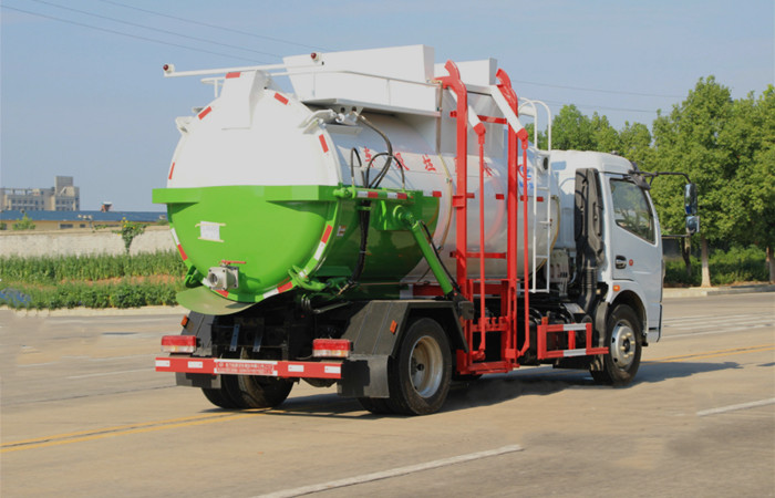 ★上裝配置:罐體采用 4mm 優(yōu)質(zhì)碳鋼制作,圓形罐體,罐體前后封頭采用圓弧蝶形封頭,配拉桿式提升機(jī),罐體底部配雙缸液壓舉升自卸,罐體尾門液壓打開和鎖緊+手動鎖緊裝置,罐內(nèi)設(shè)固液分離裝置,罐尾設(shè)液體自流閥,液位窗,后門液壓開啟,帶工具箱,洗手裝置。