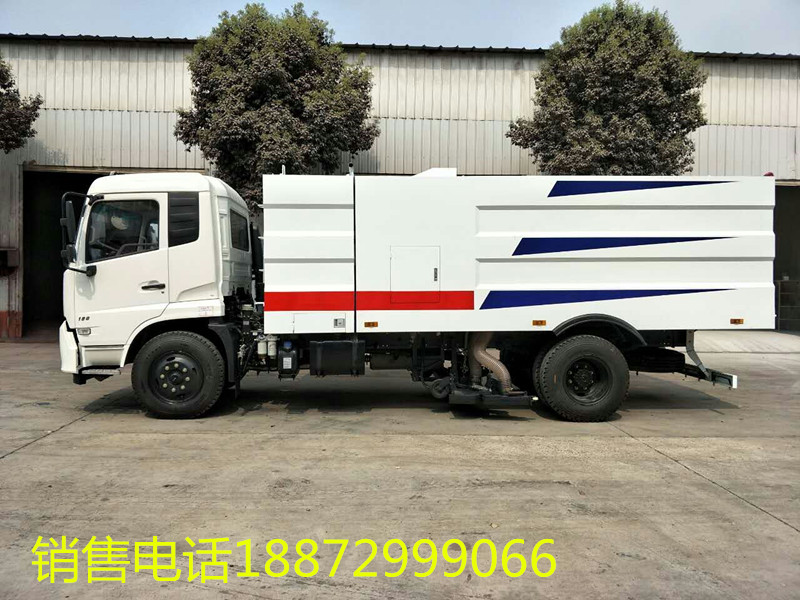 ? 洗掃車采用東風天錦DFH1180EX8型國六二類汽車底盤改裝,加裝副發動機、風機、高壓水泵、清水箱、垃圾箱、左右立掃、帶噴水桿的寬吸嘴、低壓沖洗系統、掃盤降塵系統、液壓系統、專用裝置電控系統和副車架等改裝而成。