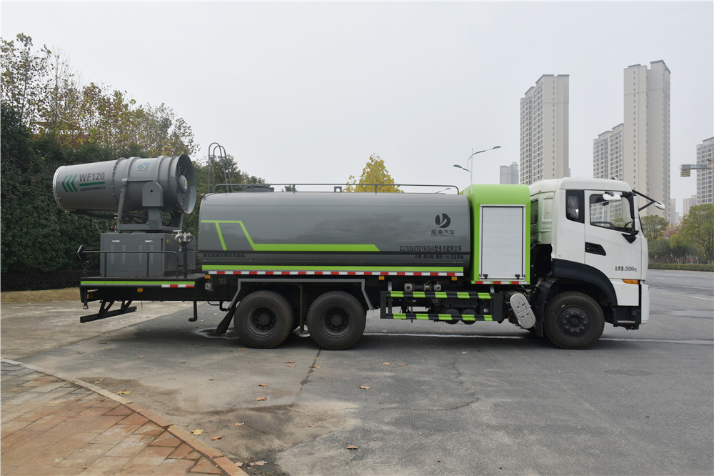 整車說明:大型霧炮灑水車該車用途為抑塵降霾,主要裝置為罐體及噴霧裝置;隨底盤選裝駕駛室,選裝噴霧裝置樣式;罐體有效容積:14立方米,罐體外形尺寸(長×長軸×短軸)(mm):5000×2400×1700;側、后防護材料均為:Q235碳鋼,連接方式均為:螺栓連接,后部防護截面尺寸(mm):120×50,后部防護離地高度(mm):480;ABS型號/生產廠家:3631010-C2000/東科克諾爾商用車制動系統(十堰)有限公司,ABS 8/東科克諾爾商用車制動系統(十堰)有限公司,4460046450/威伯科汽車控制系統(中國)有限公司.安裝120霧炮時,后伸930mm,對應整車長度為11580mm。隨底盤選裝底盤布置.