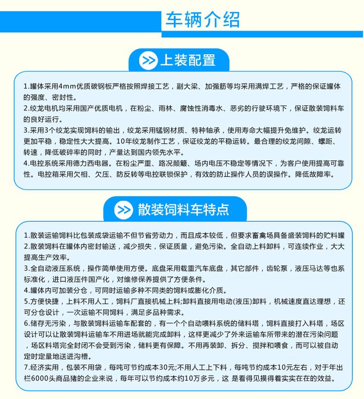 散裝飼料車,又稱散裝飼料運(yùn)輸車,飼料運(yùn)輸車。結(jié)構(gòu)簡單、性能可靠、輸送量大、操控方便、機(jī)動性強(qiáng)、對物料 等特點,廣泛應(yīng)用于各大中小型養(yǎng)殖企業(yè)的飼料的運(yùn)輸。