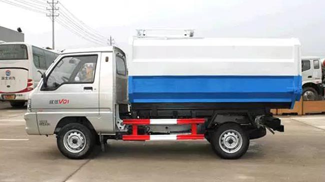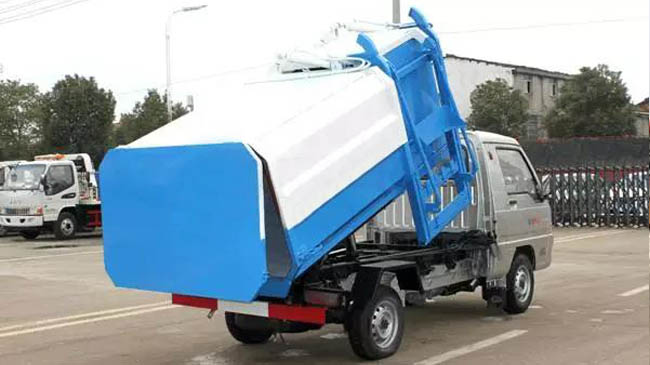 箱體容積2~3立方米,全密封式垃圾箱體,采用碳鋼邊三底四焊接制作,邊板折彎強(qiáng)化,箱體右側(cè)配液壓掛桶提升機(jī),國(guó)產(chǎn)油泵、多路閥、取力器、油缸,卸料方式為底部雙杠液壓舉升自卸,駕駛室外操作,鐵桶掛架,后門機(jī)械鎖緊,手動(dòng)開(kāi)門,可選液壓開(kāi)門。