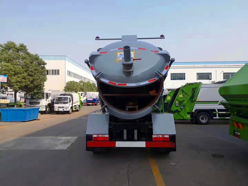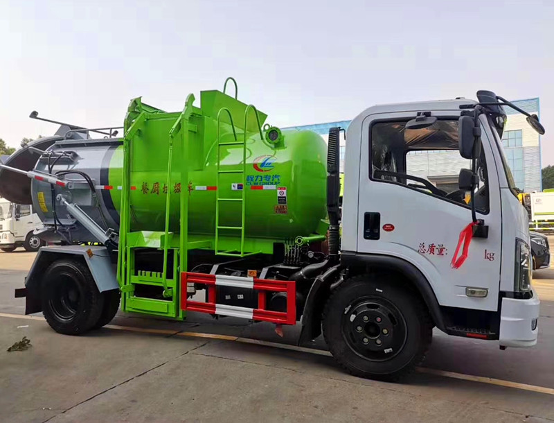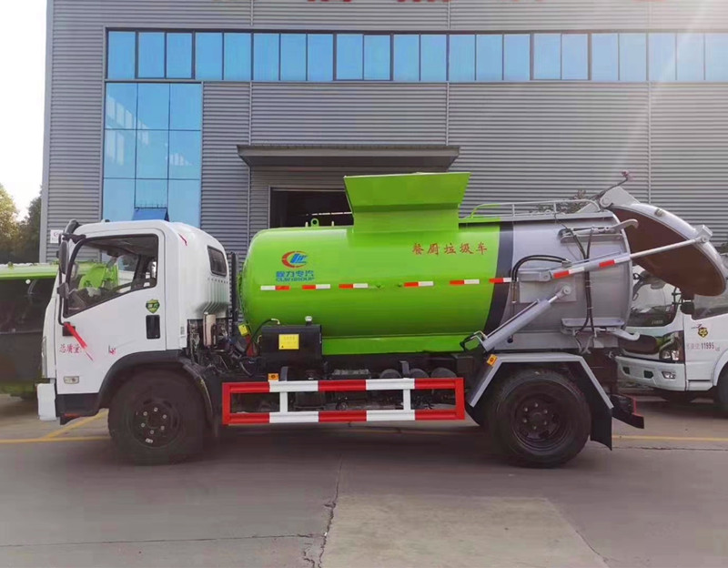 餐廚垃圾車是將桶裝泔水經該車輸送帶緩緩上輸,在車頂部倒入車廂內(車廂可分為廂體和罐體),被投放的垃圾經過強有力的推板擠壓,然后固液分離,被分離的液體進入罐體底部的污水箱,固體垃圾被壓縮儲存在罐體,體積變小,如此反復待裝滿后送至餐廚垃圾資源優化處理廠。整個過程,實現自動化。餐廚垃圾的分類收集,集中處理,不僅需要后期無害化、資源化的處理設備,還需要收集、運輸的專用車輛。因餐廚垃圾含水量高、成分復雜等特點,要求車輛密閉性好、操作簡便安全,裝卸效率高且方便,并要求與后期資源化設備配套。
