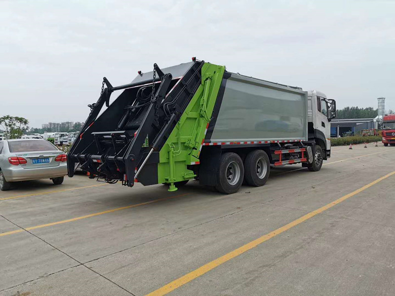 6. 方便的操作控制,作業(yè)控制盒分別安裝在駕駛室內(nèi)和車尾左右,駕駛室內(nèi)的作業(yè)控制盒可控制推擠卸料和選擇操作模式(如自動或手動),車尾的作業(yè)控制盒則控制壓填機構(gòu)和翻桶機構(gòu)的作業(yè),使用操作十分方便。特別是在垃圾填埋場,作業(yè)人員無須下車即可完成卸料和污水排放。