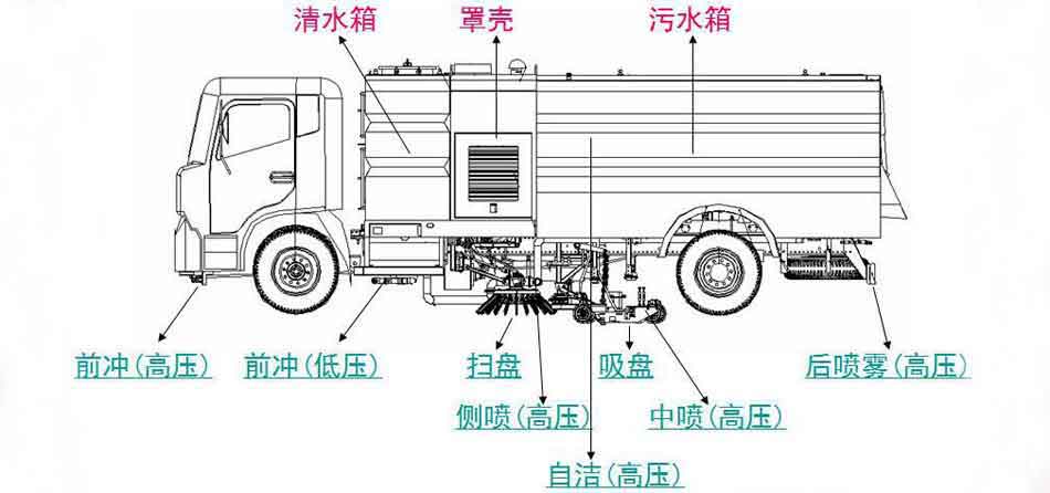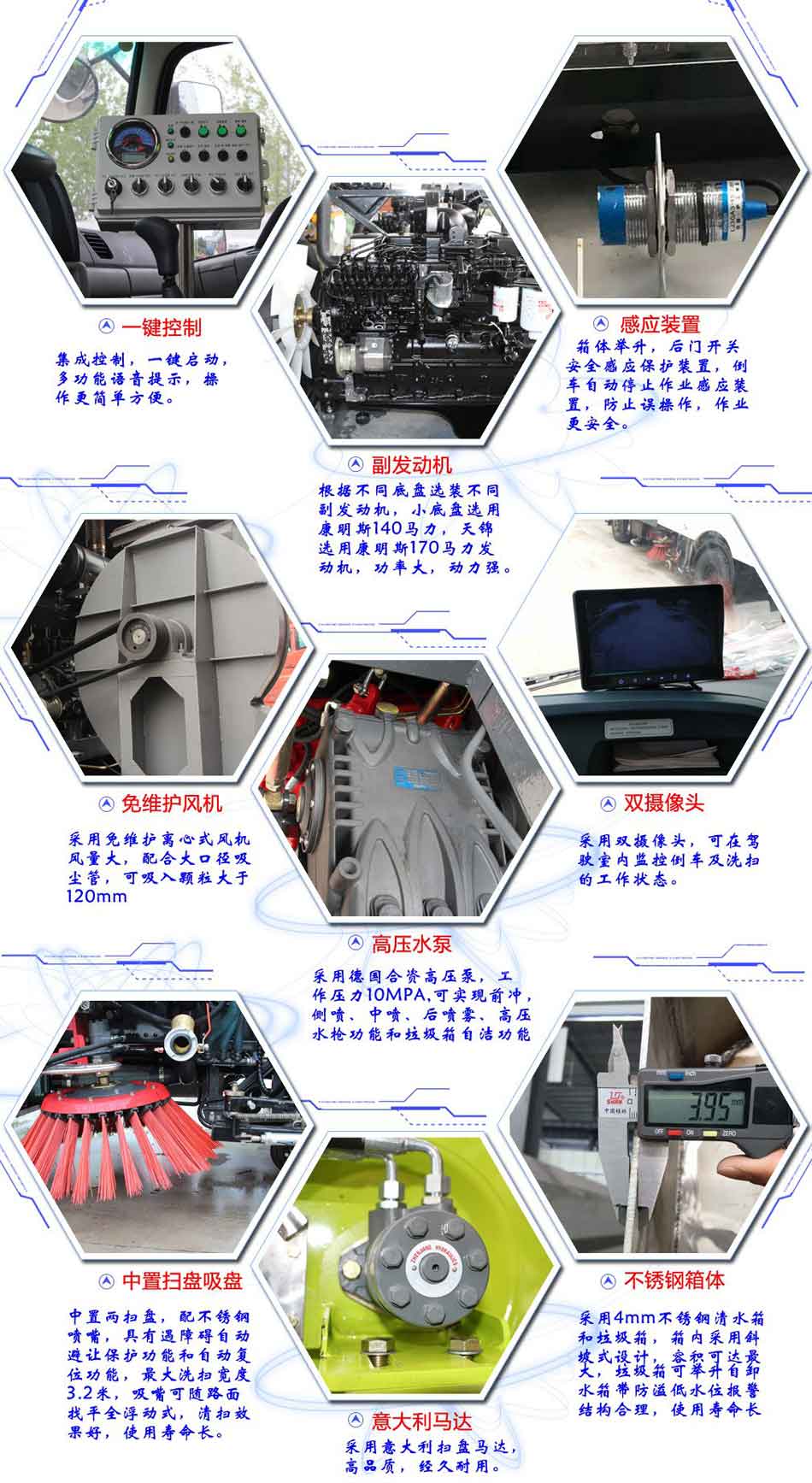 上裝配置:副發(fā)動(dòng)機(jī)采用康明斯170馬力,自動(dòng)離合器驅(qū)動(dòng)風(fēng)機(jī)和高壓水泵,有效減少風(fēng)機(jī)啟動(dòng)和停止時(shí)對(duì)發(fā)動(dòng)機(jī)的沖擊,低噪音,低油耗量和節(jié)省成本等優(yōu)點(diǎn)。采用洛陽(yáng)北玻品牌,大功率耐磨免維護(hù)離心風(fēng)機(jī),無(wú)嗓音,效率高風(fēng)量大,使用壽命長(zhǎng)。高壓水泵采用合資國(guó)際知名德國(guó)品孚,T7012IR型柱塞柱,壓力高,最高壓力可達(dá)到16MPa。清水箱充分利用車載空間,容積達(dá)到9個(gè)方,內(nèi)置水位報(bào)警器。垃圾箱采用雙層內(nèi)膽不銹鋼結(jié)構(gòu),內(nèi)部加裝過(guò)濾網(wǎng)板,有效地防止樹葉,塑料袋之類的輕飄物堵塞風(fēng)口及灰塵排出,內(nèi)置污水報(bào)警系統(tǒng),可通過(guò)后門處污水閥方便的將污水排出下水道,最大限度的利用了垃圾箱裝載垃圾的空間,廂體采用傾翻卸料,帶高壓沖洗自潔裝置。