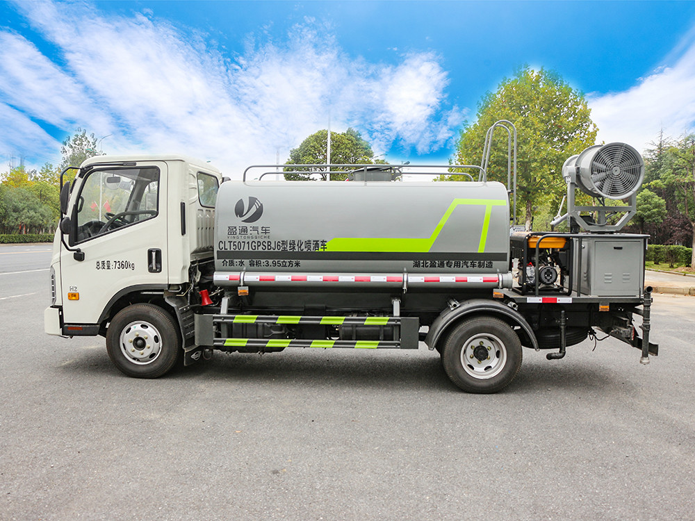 福田 H2 藍牌 5 方抑塵車-灑水車產品產品主要技術參數 序號 名稱 型號、規格 1 整車型號 CLT5041TDYBJ6 型多功能抑塵車 2 發動機型號 Q23-115C60 3 發動機馬力/功率 全柴 115 馬力/85KW 4 發動機排量 2300ML 5 變速箱 萬里揚 5 檔 6 輪胎規格 7.00 鋼絲胎 7 軸距 3360 8 總質量 4495KG 9 整備質量 3650KG 10 額定載質量 650KG 11 整車尺寸(長×寬×高) 5.998*1.99*2.6 12 罐體容積 5 方 13 燃料種類 柴油 14 排放標準 國六 15 水泵型號 40/50 16 罐體材質 Q235 碳鋼